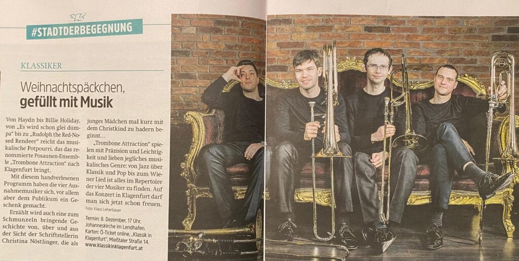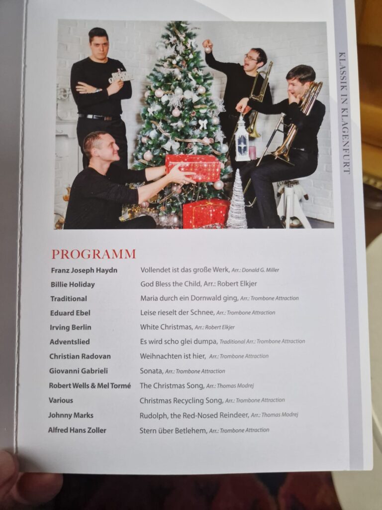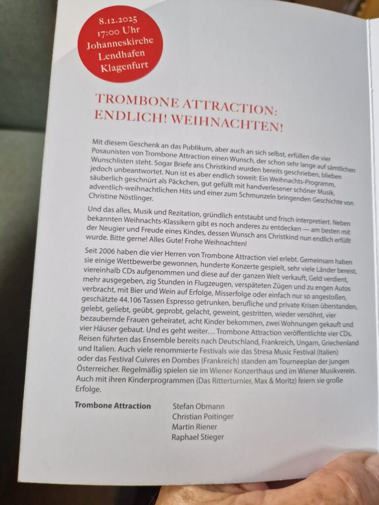Mit diesem Geschenk an das Publikum, aber auch an sich selbst, erfüllen die vier Posaunisten von Trombone Attraction einen Wunsch, der schon sehr lange auf sämtlichen Wunschlisten steht. Sogar Briefe ans Christkind wurden bereits geschrieben, blieben jedoch unbeantwortet. Nun ist es aber endlich soweit: Ein Weihnachts-Programm, säuberlich geschnürt als Päckchen, gut gefüllt mit handverlesener und schöner Musik, inklusive adventlich-weihnachtlicher Hits! Erzählt wird auch eine zum Schmunzeln bringende Geschichte von, von Christine Nöstlinger. Und das alles, Musik und Rezitation, gründlich entstaubt und frisch interpretiert. Neben bekannten Weihnachts-Klassikern gibt es noch anderes zu entdecken — am besten mit der Neugier und Freude eines Kindes, dessen Wunsch ans Christkind nun endlich erfüllt wurde. Bitte gerne! Alles Gute! Frohe Weihnachten!